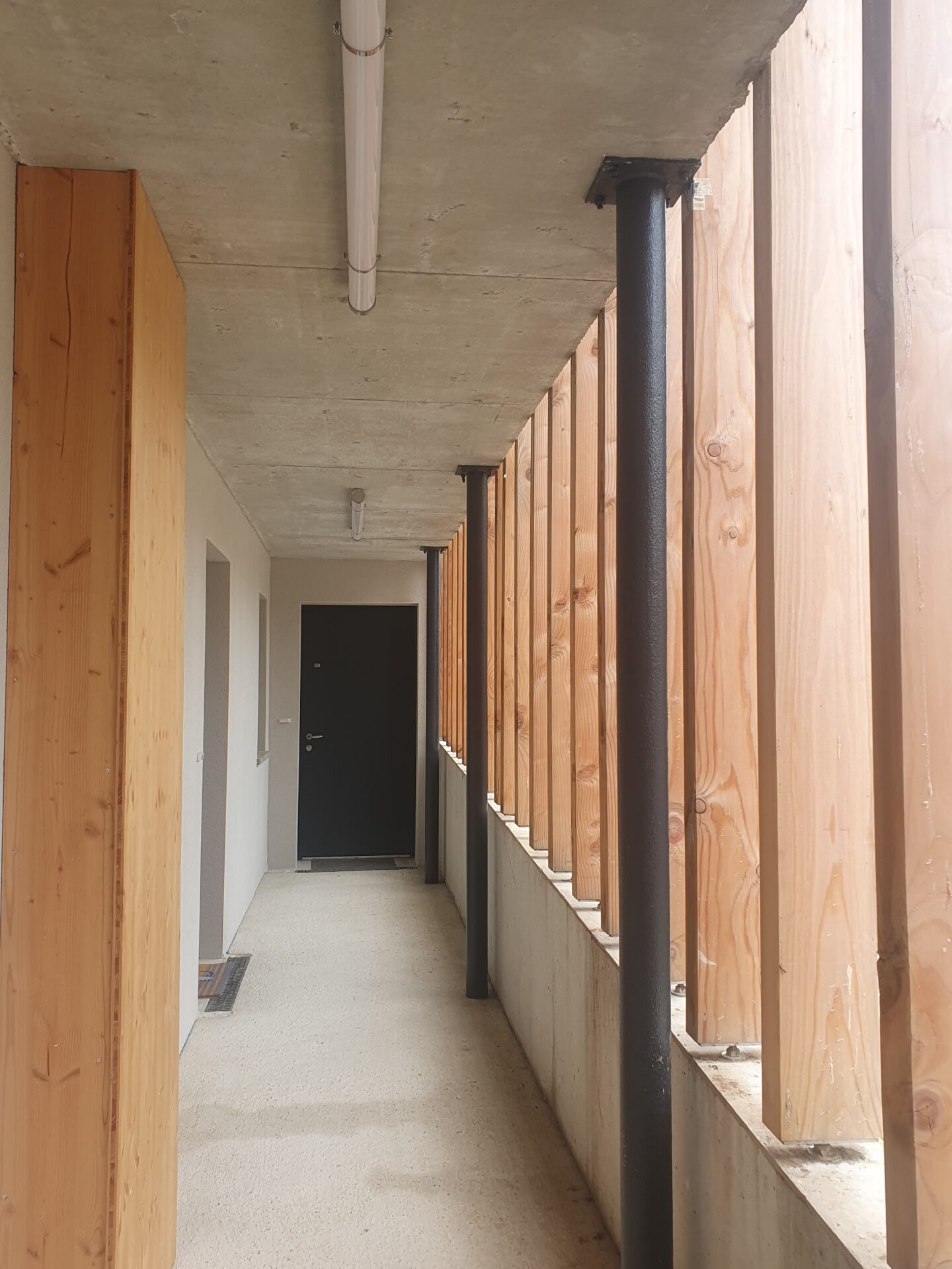 Le projet s'échelonne en front de rue, par une série de 8 maisons individuelles de type T4, espacées les unes des autres et réparties entre le terrain A et le terrain C. Sur le terrain B, formant angle, prend place un ensemble de 6 logements superposés: 3 T5 en rez-de chaussée avec jardin et 3 T3 à l'étage. L'ensemble est ainsi subdivisé sur sa longueur en 11 parcelles, incluant à chaque fois la construction côté rue, et un jardin privatif à l'arrière. Cette configuration permet d'optimiser au mieux les vides ainsi créés (jardins et aires de stationnement) tout en formant un linéaire bâti qui définira clairement l'espace de la rue. Les habitations s'élèvent en R+1, sous forme de petits volumes parallélépipédiques en béton matricé, formant un premier plan à échelle humaine, dialoguant avec les immeubles du Grand Ensemble à l’arrière plan. La technique de banchage donne du relief au béton, laissé apparent. Il prend ici le motif d'un bardage bois recouvert d'une lasure de teinte marron, apportant au site une couleur chaude qui s'intègre à la masse boisée qui l’entoure. Chacune des 11 parcelles est clôturée sur son pourtour, soit par un muret maçonné surmonté d'une grille en serrurerie (en limite avec emprise publique), soit par un treillis soudé (en limite mitoyenne) doublé d’une haie végétale. Site : Rive de Gier (Loire) Maître d’ouvrage : THOMAS SA AMO : Groupe Action Logement Maître d’œuvre : AJ architectes & BAI ICOBA, Synergisud, CM Economistes Montant des travaux : 2 000 000 €HT Type de mission : Complète Surface : 1 374 m2 Étude : 2017 Année de réalisation : 2018-2020 ![]() ![]() ![]() ![]() |