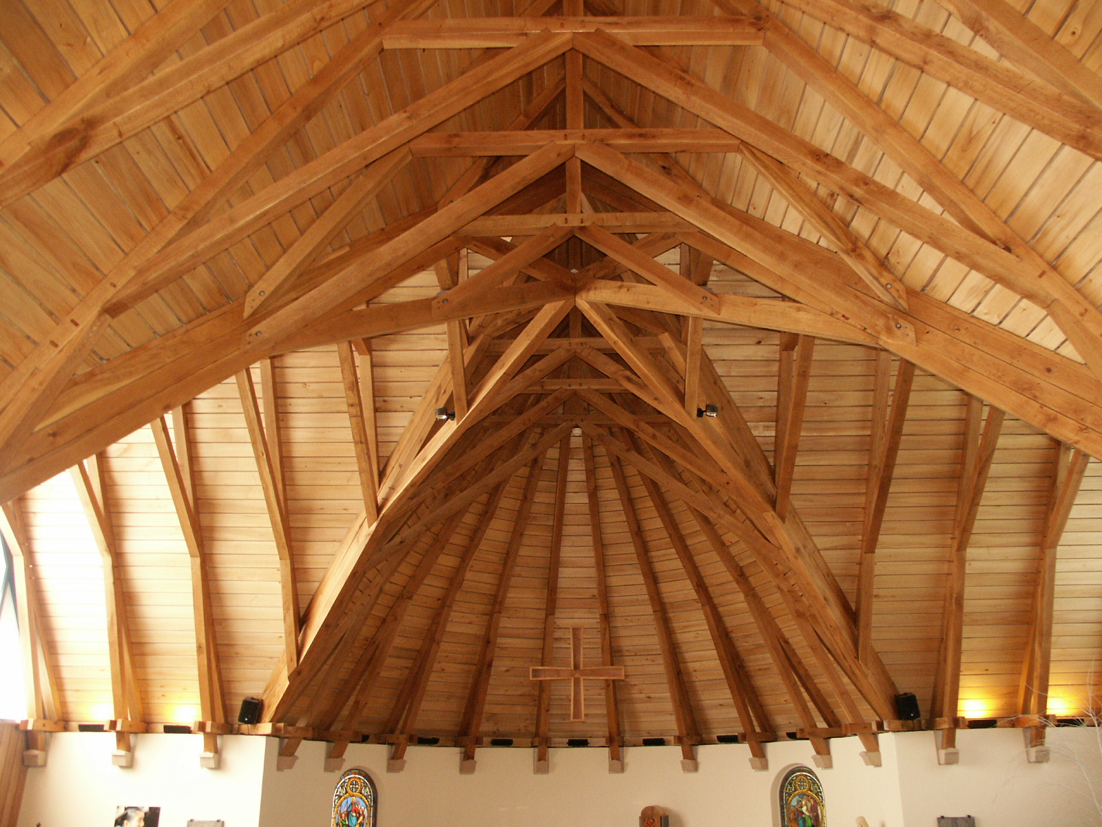 Mais l’édifice affirme dès l’abord sa remarquable charpente. Constituée de fermes disposées suivant un entraxe très court, celle-ci en définit le volume et l’ambiance intérieure. Faisant référence aux charpentes traditionnelles du Moyen-Âge, le projet a néanmoins fait appel aux techniques de calcul les plus modernes, pour couvrir la nef d’un ensemble de « fermettes » en chêne entièrement réalisées avec des bois de section 10×10 et sans clou ! Le bois dur utilisé dans les éléments porteurs s’oppose