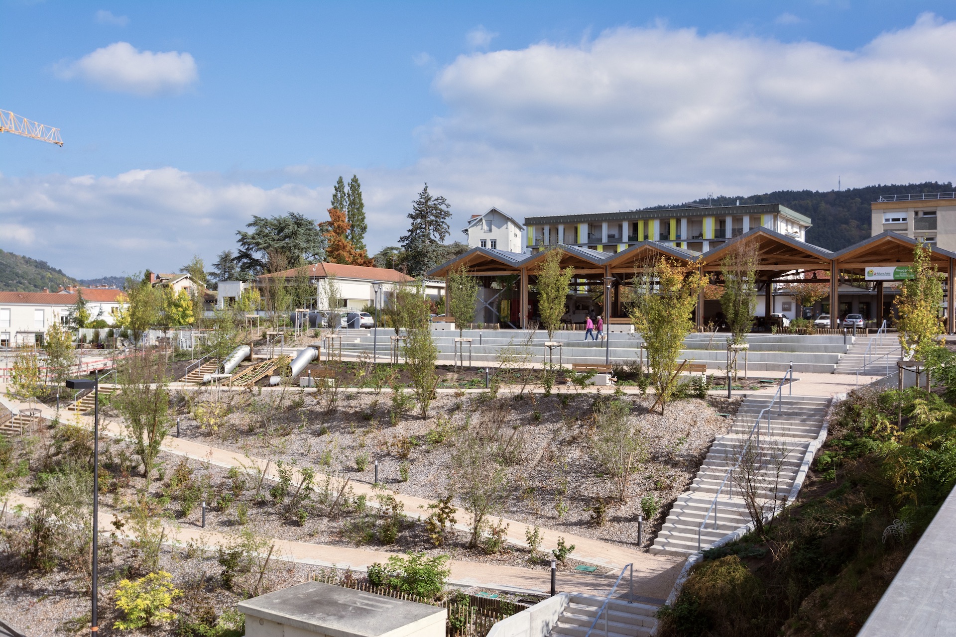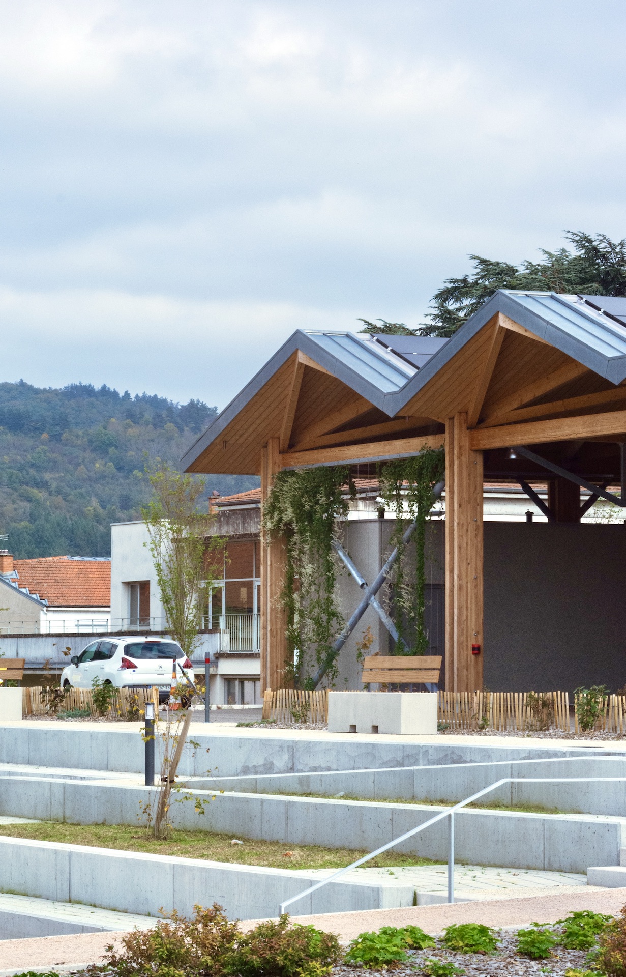 La vocation de la Halle est d’accueillir et abriter les évènements de la communes. Hors évènement, elle offre du stationnement, les surfaces imperméables se superposent pour réduire leur emprise. Par son positionnement, elle devient un trait d’union entre les équipements et commerces environnants, et une nouvelle centralité d’Aurec.
