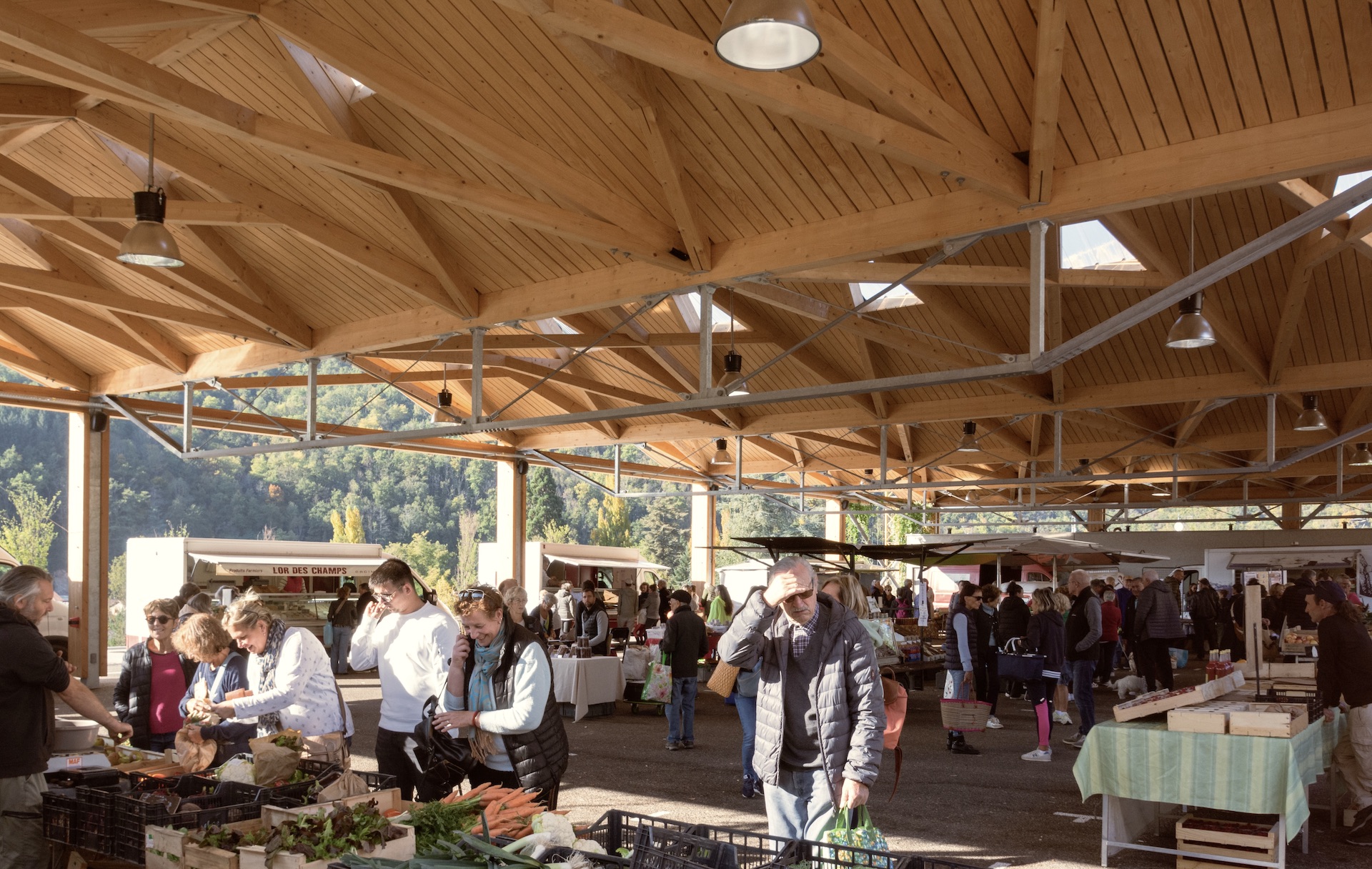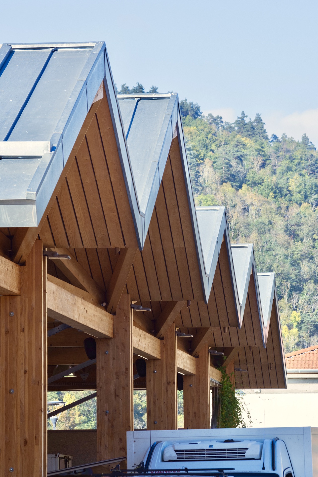 « La couverture de la Halle est conçue comme une succession de toitures à deux pans, qui font écho aux toiture du centre-bourg, avec des panneaux photovoltaïques sur les pans Sud, et des apports de lumière naturelle sur les pans Nord »