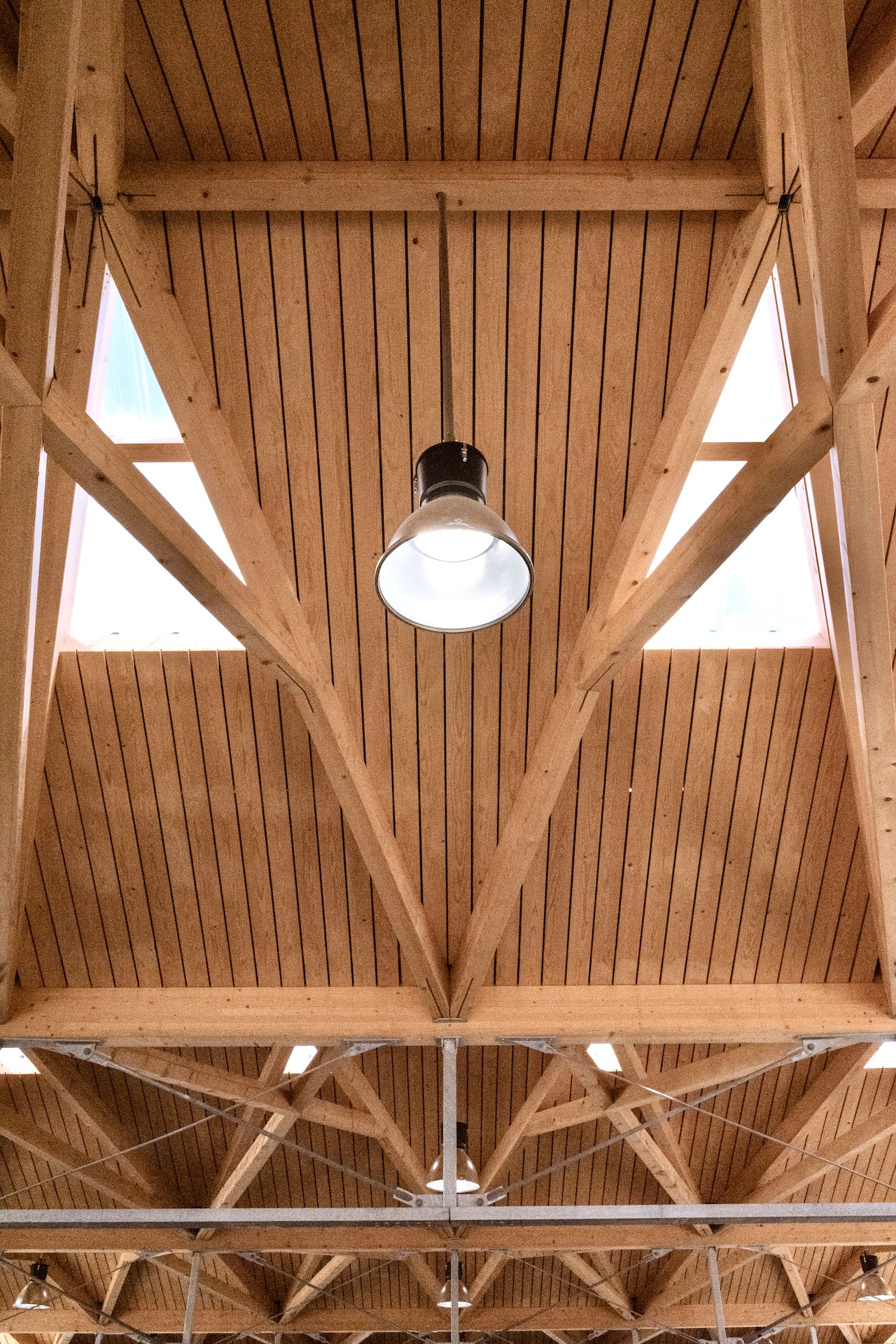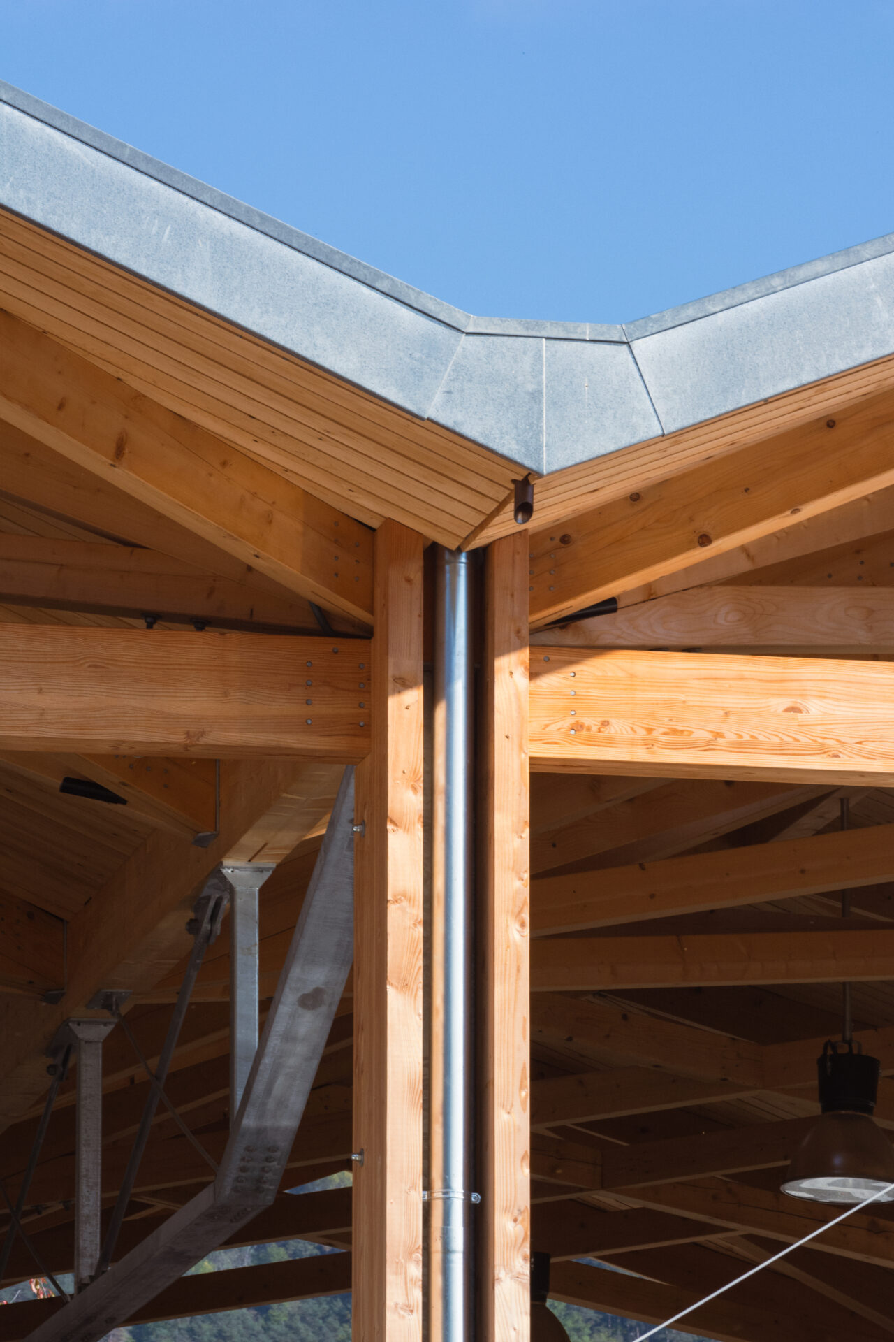 La structure est en bois. Les files porteuses, au niveau des noues, sont composées de poteaux et de poutres sous tendues bois-métal. Elles supportent des fermes en croisées d’ogives qui assurent le contreventement, et anime la sous-face.