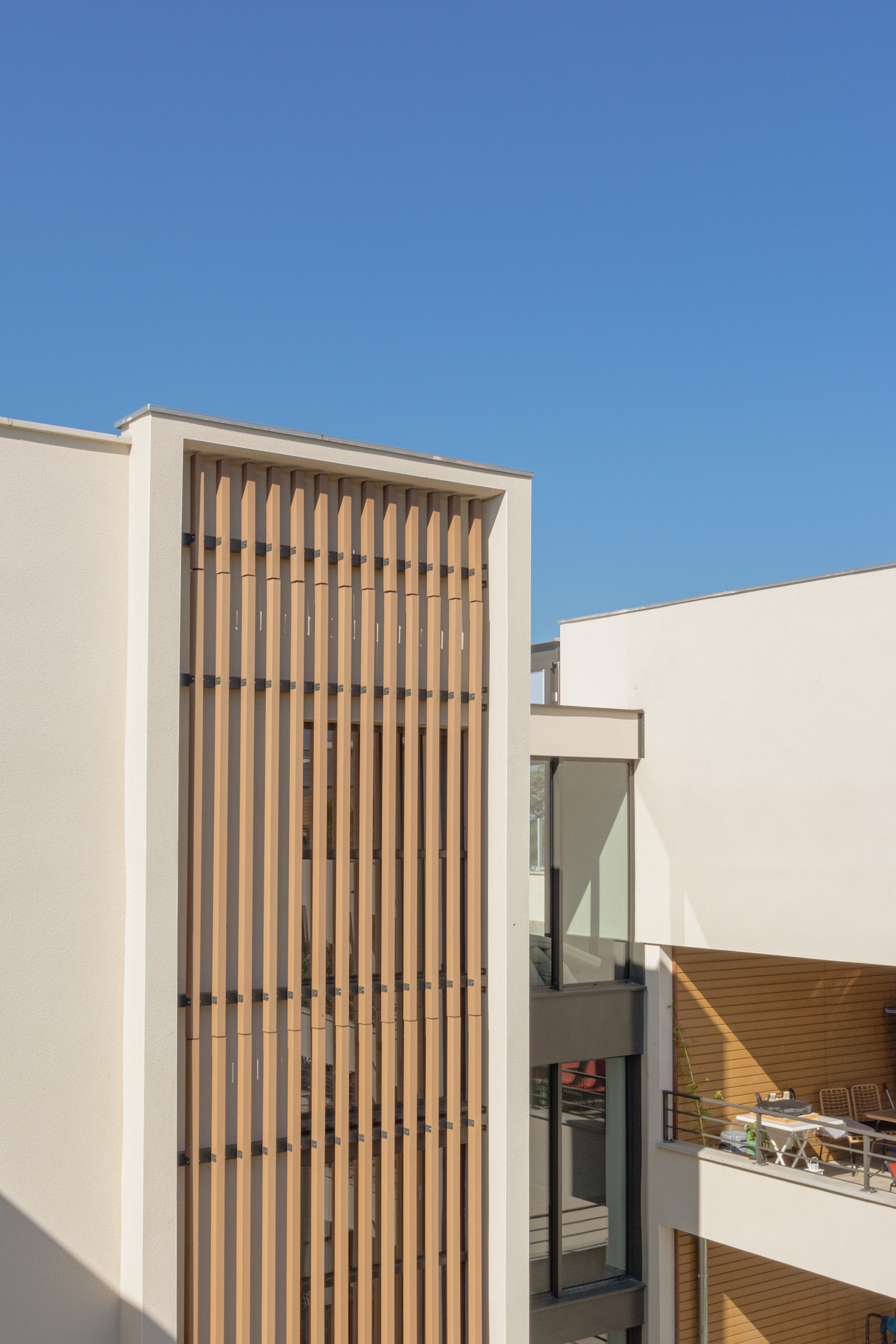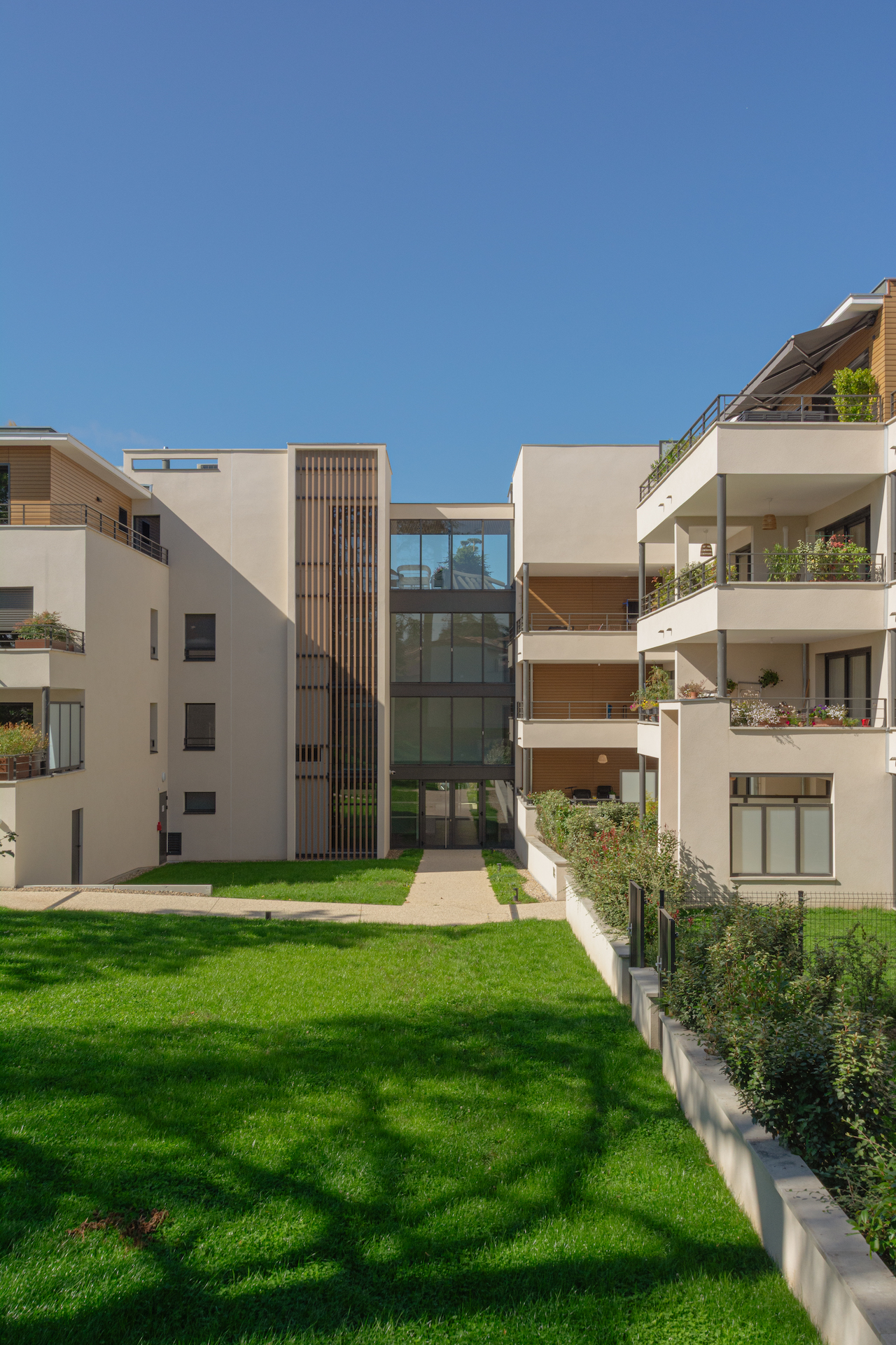Chacun des appartements au sein de la résidence est lui-même réfléchi en fonction de sa position, pour s’ouvrir aux vues particulières ou protéger son intimité. Les passages entre la sphère publique et la sphère privée sont autant de séquences, traitées avec attention. Les parcours menant du dehors au dedans, sont qualifiés par le dessin des espaces, par les apports de lumière naturelle, par le choix des matériaux.